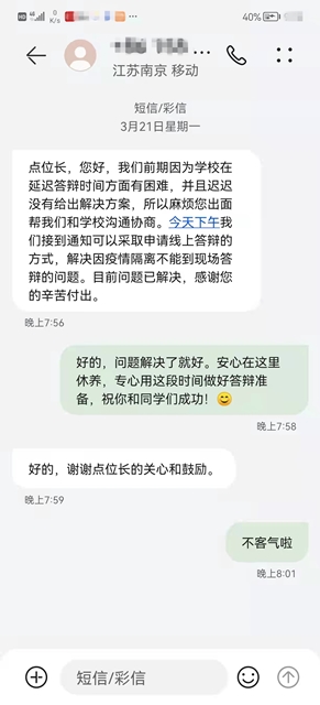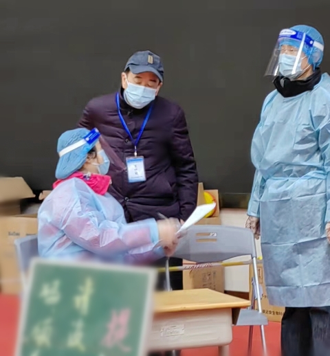 “喂,您好,请问是美居酒店的点位长吗?请您一定要帮帮我!” 3月20日晚上十点多,一阵急促的手机铃声响起,区人大常委会研究室副主任樊德宝接通电话,听筒那头的声音听上去非常焦急,边说边哭。经过询问,原来是正在酒店隔离的高校应届毕业生,担心自己处在集中隔离期而赶不上学校即将举行的毕业答辩,情绪十分激动,急切地想要寻求帮助。樊德宝耐心倾听并安抚了近一小时,让学生的情绪平复了下来。挂下电话后,他立刻与疫情防控指挥部高校组取得联系,积极与学校沟通协商。几天后,隔离大学生接到了学校通知,可以采取申请线上答辩的方式,顺利解决了因疫情隔离而不能到现场进行毕业答辩的问题,她高兴地发送了一条信息,向点位长的辛苦付出和关心鼓励表达了真挚的谢意。“有的隔离人员存在焦虑情绪在所难免,我们会关注重点人群,发现异常情况后和人文关怀组及时进行疏导,缓解他们的情绪,尽全力帮助协调解决问题。”樊德宝说,这本来就是自己应该做的。 本轮疫情发生以来,南京市鼓楼区人大机关先后有9名机关干部担任街道居民核酸检测点的点位长,2名机关干部担任临时集中隔离酒店的点位长。他们坚决服从组织安排、接到任务不讲条件,“扎根”在各自点位上日夜奋战,为筑牢疫情防线积极贡献着人大力量。 自接到担任集中隔离点“点位长”的任务后,区人大常委会研究室副主任樊德宝、区人大法制委副主任委员朱晓斌第一时间赶往指定地点报到,酒店快速改造“变身”新增隔离点、严格区分隔离人员转运和工作人员通道、明确防疫物资运输流程、确保垃圾清运独立闭环、按时巡查隔离区外围......半个月来,每天指挥调度接收、解隔、转运,“吃喝拉撒睡”样样都要管,24小时“全天候”随时待命已是他们的工作常态。凌晨三点半,手机又响起工作群信息提示音,数百名需要隔离的人员即将转移安置到各集中隔离点。点位长再一次匆匆起身用凉水洗了把脸,随即赶到酒店门口做好接收准备。 “哪里需要到哪里”。3月中下旬,鼓楼区在部分街道、部分社区开展规模性核酸检测,每一轮的核酸检测现场,都能看到人大机关的“点位长”忙碌的身影。区人大法制委主任委员潘永吉有腰痛的老毛病,一到春季很容易复发,但他却轻伤不下火线,忍着疼痛,在幕府山街道的核酸检测点位来回奔走。作为点位长,要牵头协调各项防疫事务,确保检测现场防疫物资到位、医护人员和志愿者到位、“一米线”间隔执行到位......遇到行动不便的老人,主动上前搀扶并贴心地引导至“绿色通道”,为群众提供更多便利。上周气温骤降,又赶上大雨,不少检测点都在室外,但为了居民核酸检测高效有序开展,人大干部们无畏风雨,在寒风中坚守岗位,一忙就是一整天,有时遇到检测“高峰期”连饭都顾不上吃。从春寒料峭的清晨到万家灯火的夜晚,大家用有温度的实际行动坚持着“硬核”防疫与“暖心”服务,为守护南京贡献着人大力量!