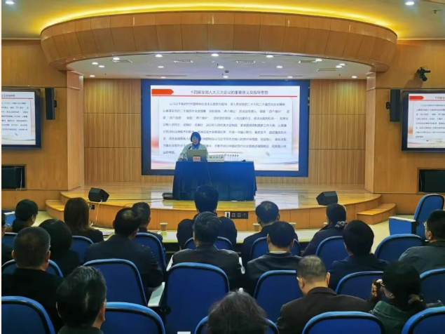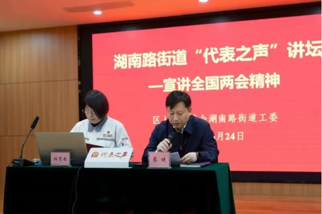 今年是全面贯彻党的二十届四中全会精神、实施“十五五”规划的开局之年。为深入学习宣传贯彻全国两会精神,推动两会精神在基层落地生根,3月24日,由湖南路街道主办的“代表之声”讲坛——全国两会精神专题宣讲活动正式开讲。作为今年首场“代表之声”讲坛,活动特别邀请全国人大代表、中车南京浦镇车辆有限公司电焊工、首席技师、高级工程师孙景南同志作专题宣讲。区人大常委会副主任陈福泉,湖南路街道和热河南路街道代表组部分人大代表,湖南路街道部分议政代表;市区双结对双促进单位党员代表,湖南路街道、湖管会部分党员干部,辖区各领域党员代表共约220余人参加。